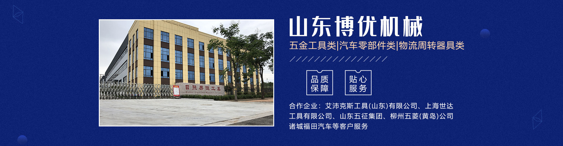 分公司日照易捷工具制造有限公司坐落在山東省日照市五蓮縣工業(yè)園,占地65畝(五蓮縣日照路與人民路交匯處),現(xiàn)有員工60名。公司主要產品有五金工具類及汽車零部件類、模具制作等三大系列。 主要設備有加工中心、數(shù)控車床生產線、磨床、研磨機、拋光機、冷鐓擠壓成型機、數(shù)控液壓模鍛錘等機械加工設備140余臺套。公司主要為艾沛克斯工具(山東)有限公司、上海世達工具有限公司、山東五征集團、柳州五菱(黃島)公司、諸城福田汽車等客戶服務。公司多年被評為優(yōu)秀供應商。